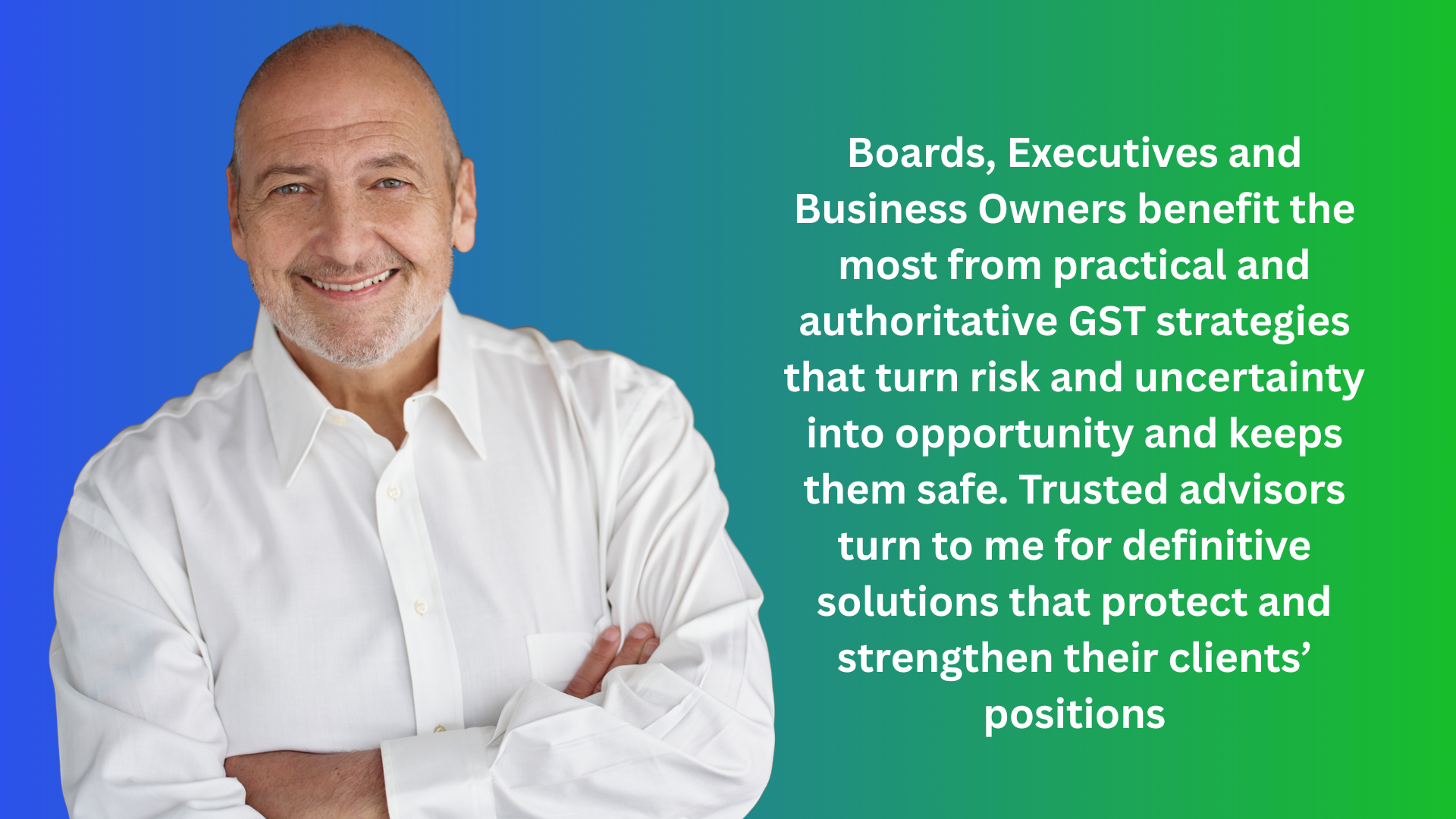 GST can be complex or uncertain, arising from ATO disputes or never-ending audits, challenges in finalising contractual agreements, challenges in the marketplace, conflicting GST advice from other advisors, not being confident of the GST positions you are taking or just making sense of GST rulings and law. I will be guided by a well-tested methodology to cut straight to the real issues, demystify it and give you definitive recommendations as to the best way to proceed. You should sleep at night, knowing that I’ve got your back and will keep you safe. Getting the initial GST answer is only part of what is needed; converting the best GST position into realistic and implementable business outcomes is the end game. I’m called MR GST by many, for good reason. If you’re troubled by GST or are responsible for GST in your business Click Here